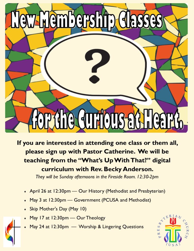 Are you interested in becoming a member of the First Presbyterian Church of Sandpoint? Pastor Catherine and Rev. Becky Anderson are leading a class for all who are interested on April 26, May 3, May 17, and May 24 in the Fireside Room, 12:30-2:00.